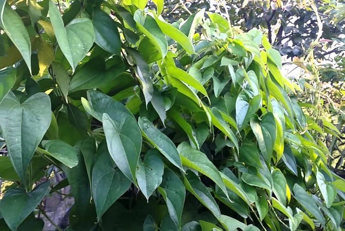 Đặc điểm hình thái, sinh thái: Cây dây leo, thân nhẵn, hơi có cạnh và viền cạnh có màu đỏ. Lá đơn mọc so le hay mọc đối hình tim dài, đầu nhọn, nhẵn, dài 8 – 10cm, rộng 6 – 8cm, gân lá 5 – 7, cuống lá dài 1,5 – 3,5cm. Cụm hoa mọc thành chùm ở kẽ lá gồm nhiều hoa nhỏ, màu vàng, hoa đực và hoa cái khác gốc, cụm hoa đực dài 40cm, cụm hoa cái cong dài 20cm, bao hoa có 6 phiến dài bằng nhau, có 6 nhị.